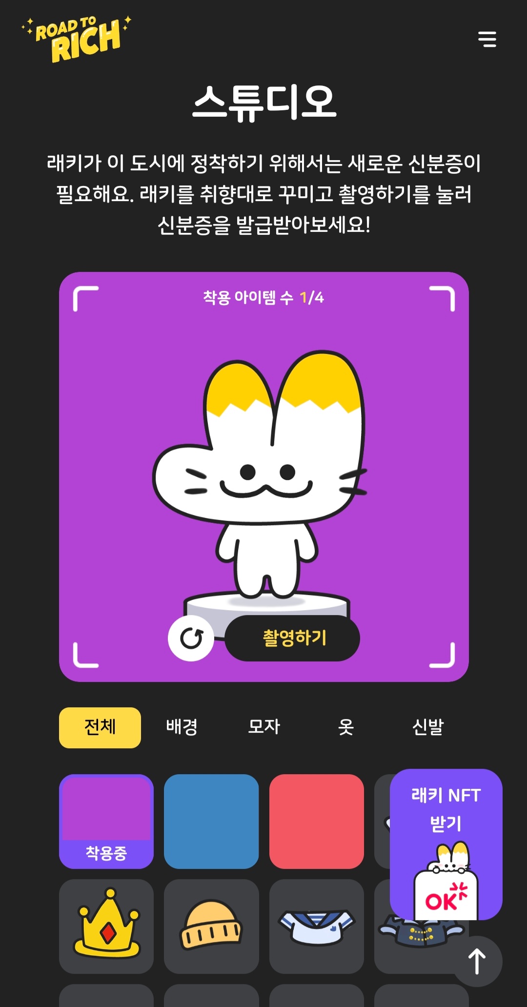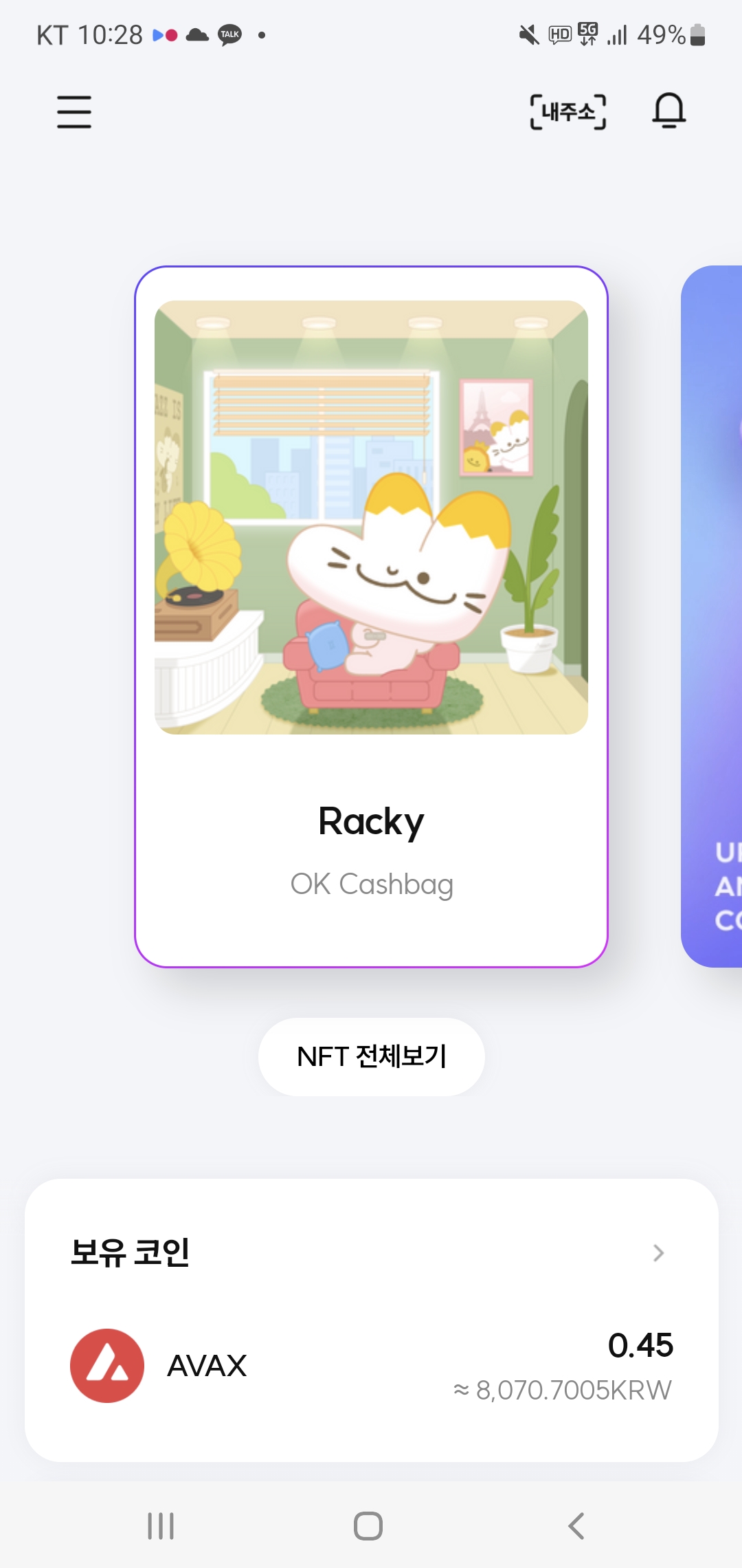 이렇게 회원가입을 완료하고 오케이캐시백 앱과 연동을 마치면 래키 nft가 지급이됩니다.