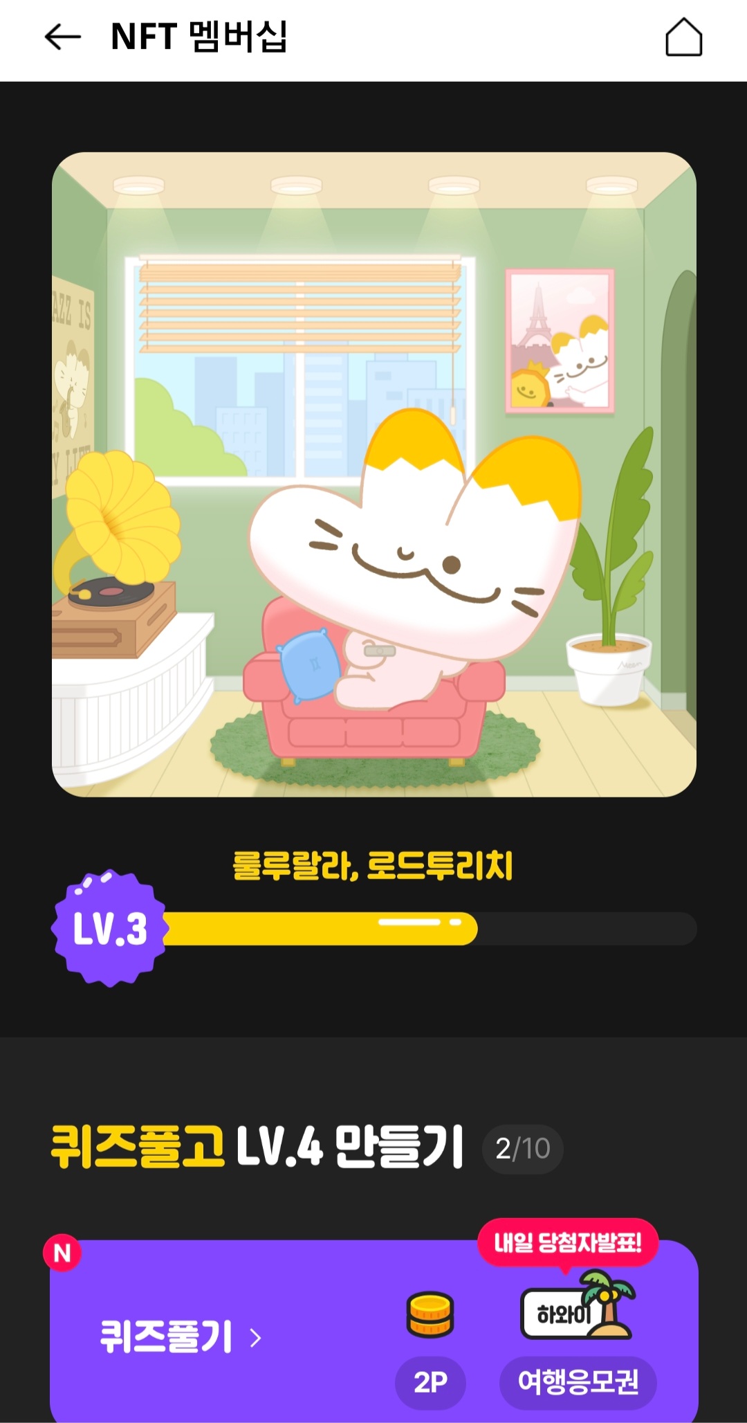 에피소드 1은 퀴즈를 풀고 래키를 레벨 5까지 만드는 것입니다. 매일 퀴즈를 1개씩 풀 수 있으며 틀려도 바로 도전이 가능하기 때문에 아주 쉬운 미션입니다.