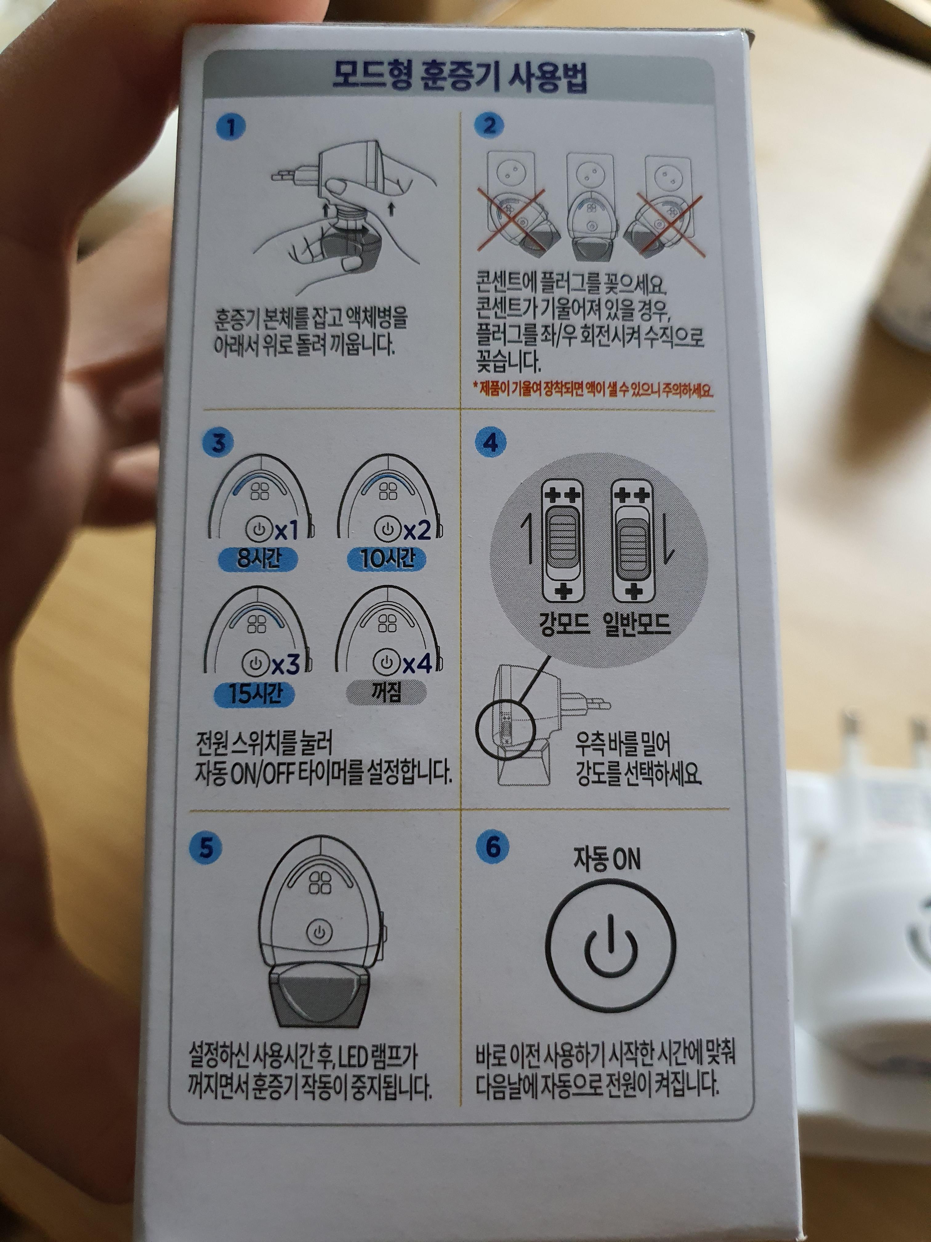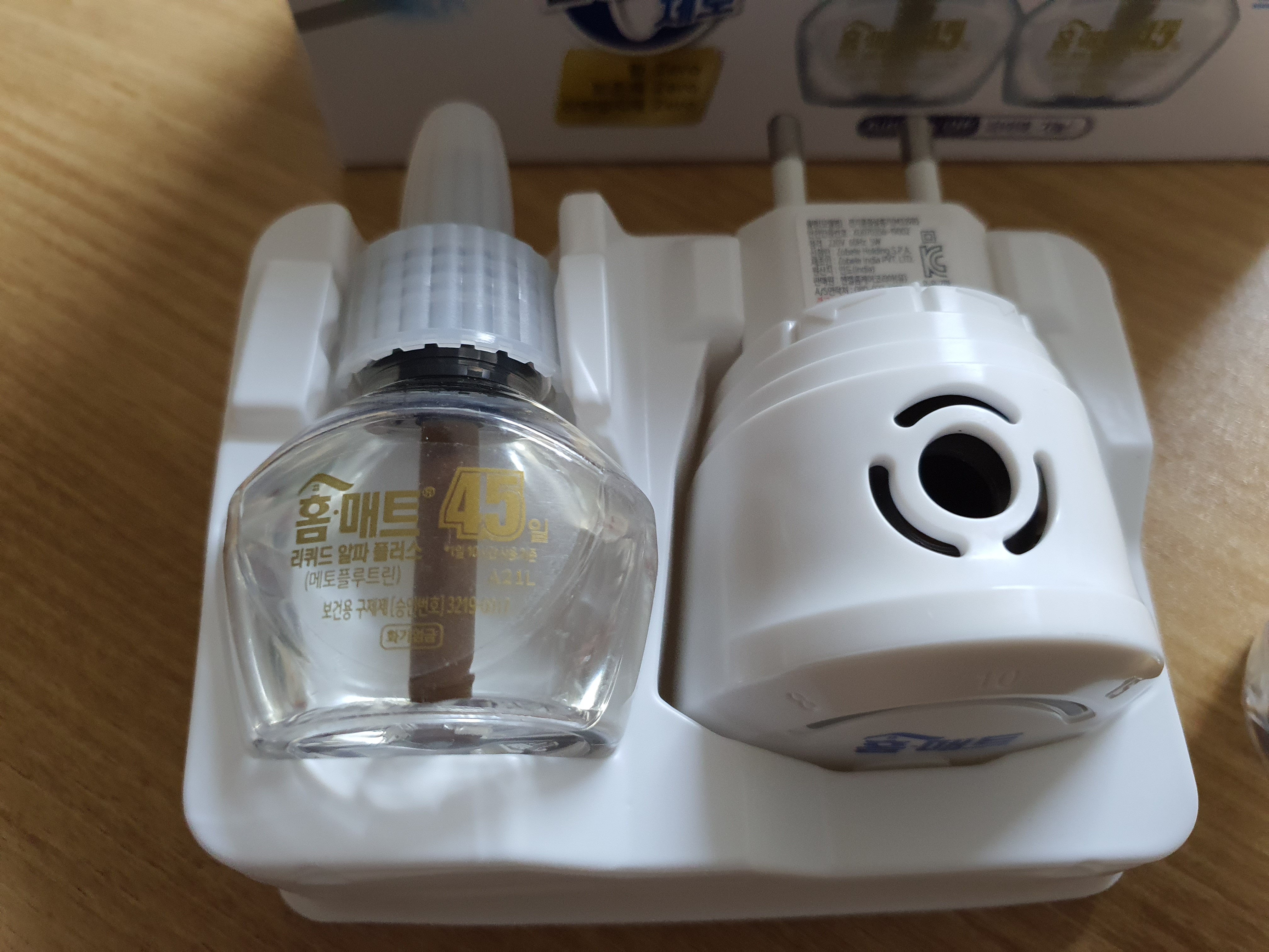 이 제품은 보시다시피 콘센트 부착형으로 콘센트에 직접 꽂아 45일 간 사용할 수 있는 제품입니다. 제가 구매한 제품은 2개가 구비되어 취침하는 침실과 생활하는 거실 두 곳에 장착할 수 있게 준비했는데요.